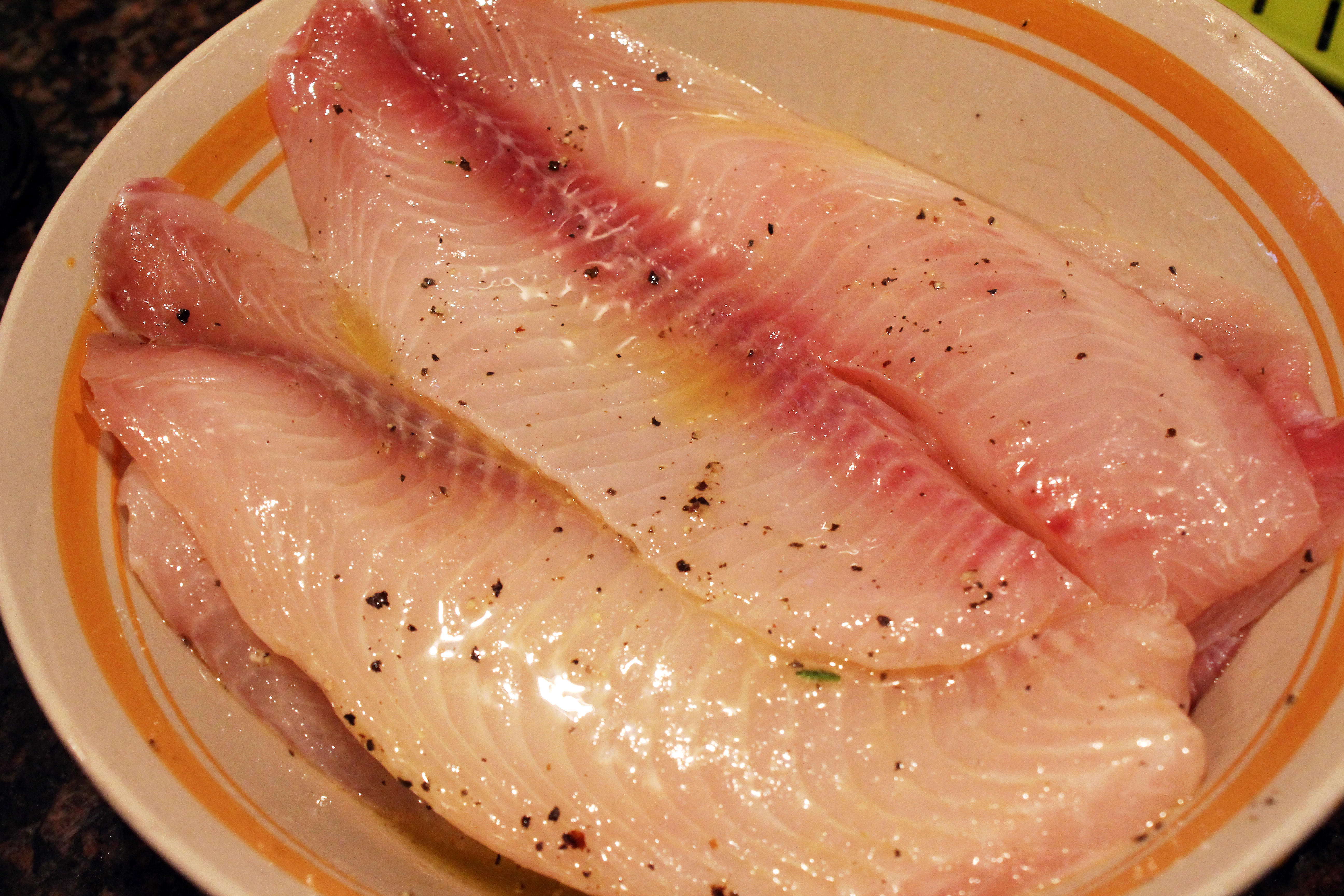 Throw fish into the bowl, making sure all sides get coated in the oil mixture. Let it sit for about 15-20 minutes.