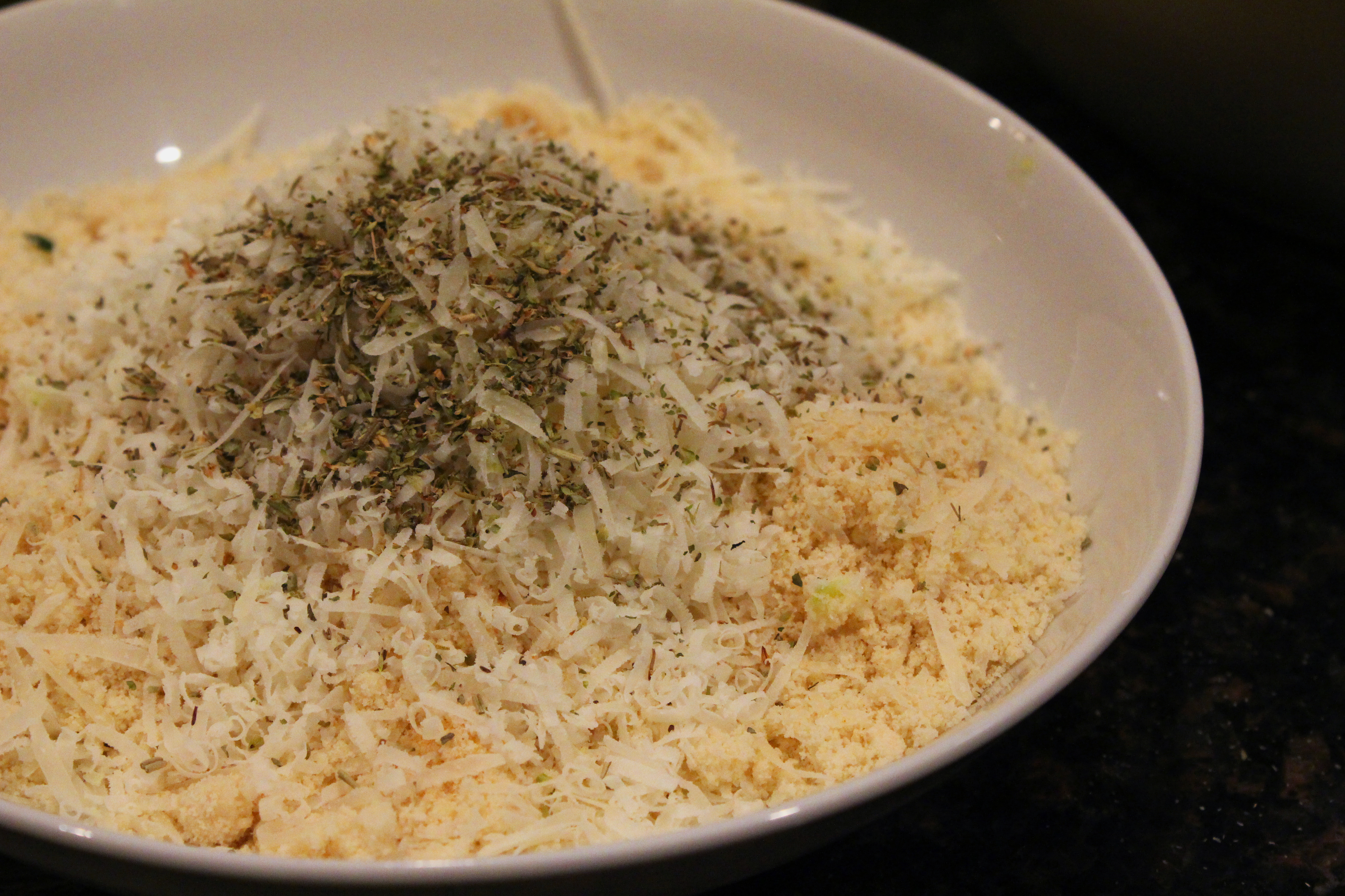 Mix together almond meal, parmesan cheese, Italian Seasoning, and garlic powder in a bowl.