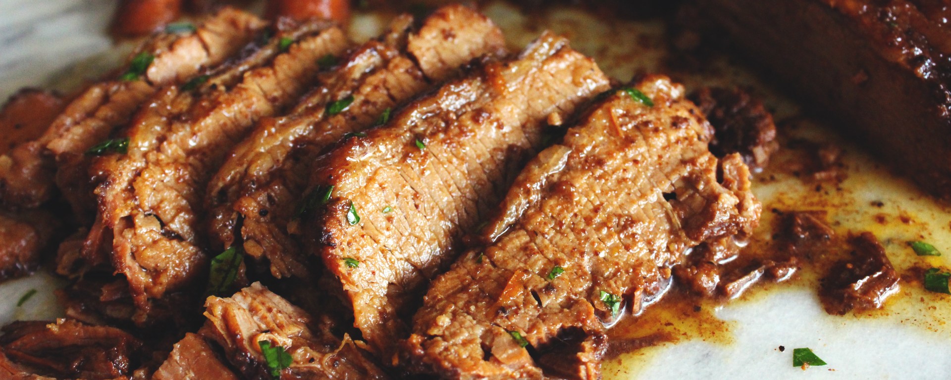 Place slices onto plates and pour a few teaspoons of cooking juices over them. If you plan on serving pulled brisket, you can cut larger slices and loosely tear them apart with your hands.