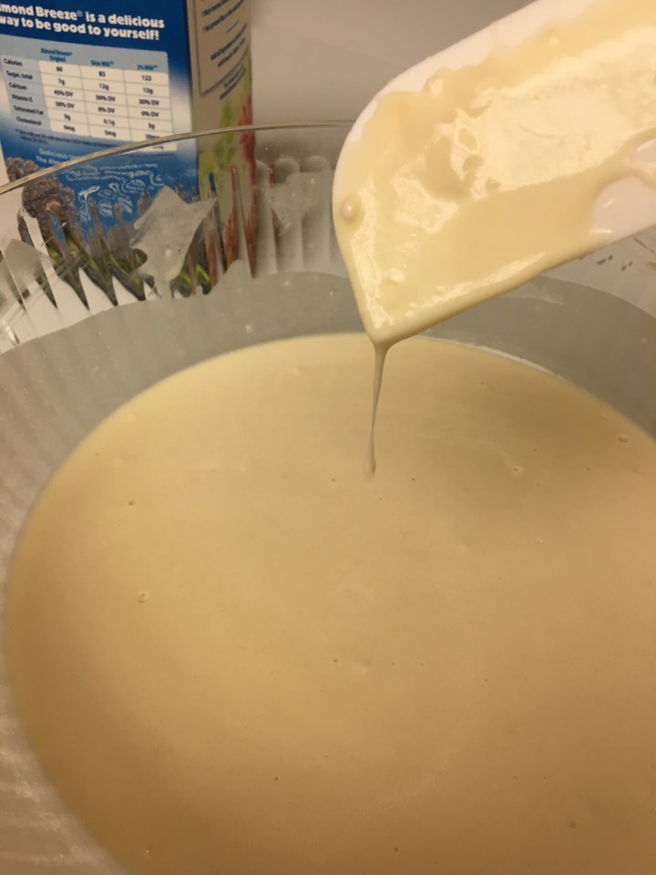 Pour the warm water into a large bowl. Sprinkle the yeast on top, let it sit for about 10 minutes. Stir in the butter, almond milk, cream, vanilla, sugar, and salt. Slowly mix in the flour, breaking up any clumps. The batter will be fairly runny like below: