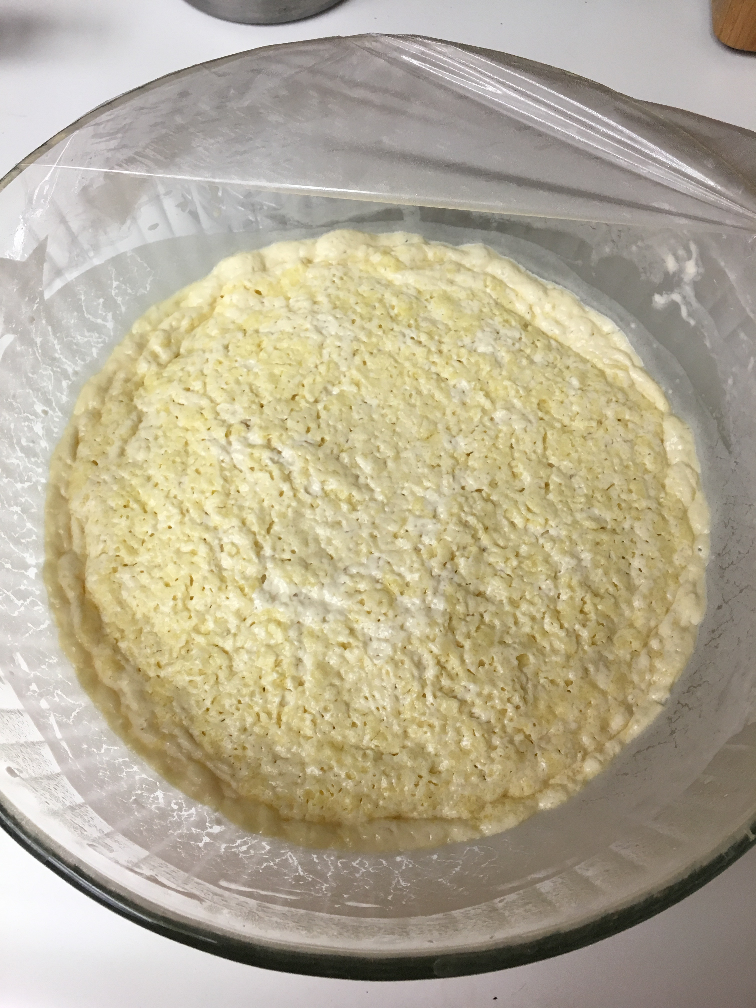 Seal bowl tightly with plastic wrap, and set on your counter overnight for at least 8 hours. In the morning the batter will look strange- kind of like a bubbly cake that’s deflated: