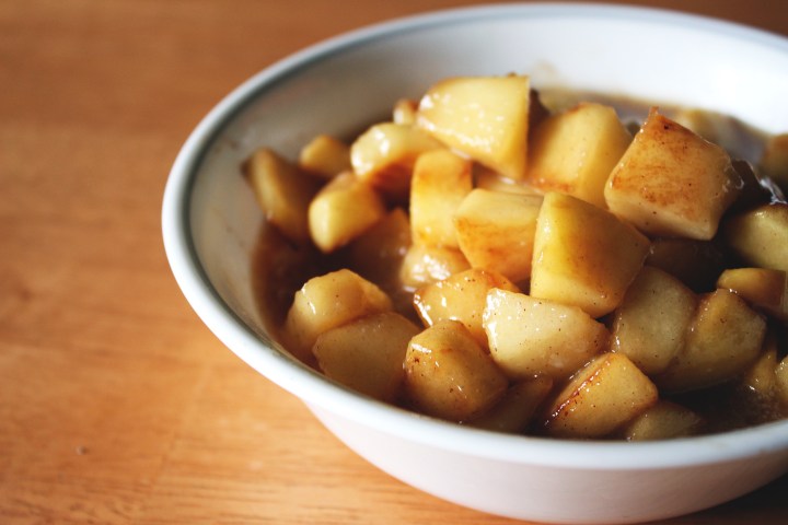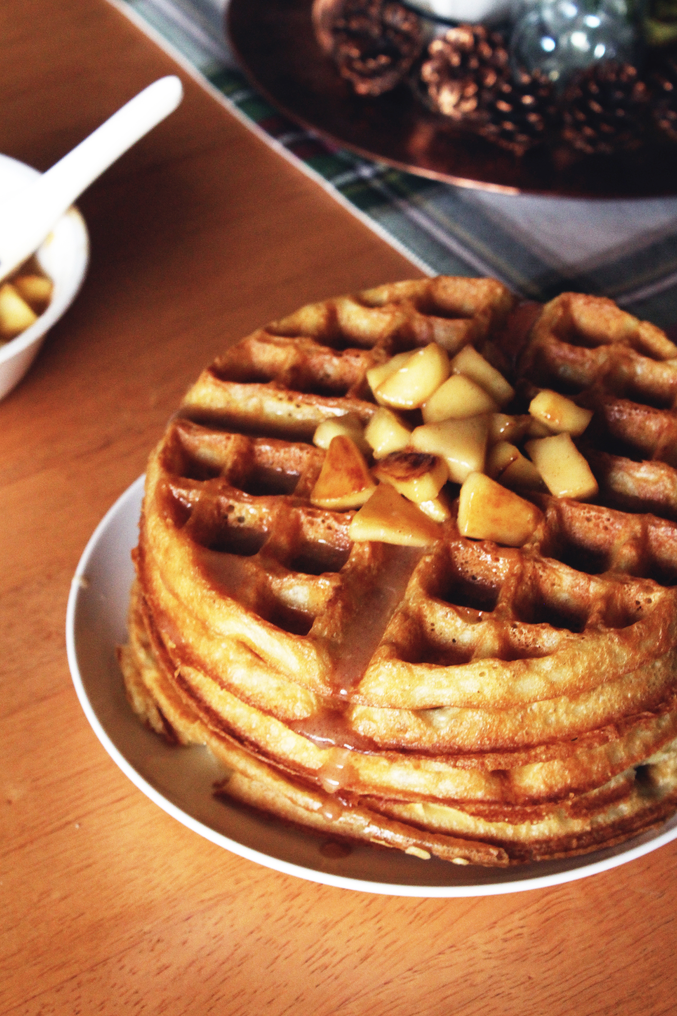 I love fruit on my waffles, so I made a caramel apple topping very similar to pie filling. Tart chunks of apple with a squeeze of lemon and touch of cinnamon, cooked hot and fast in a pan so they still have some bite to them, then tossed in a sweet and salty sauce that is just a few ingredients short of a caramel.
